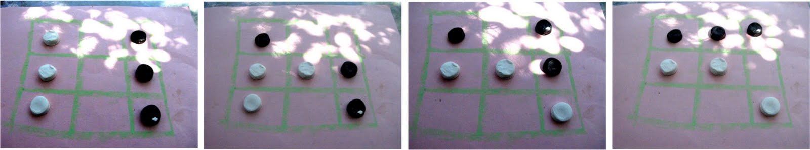 Two players start on either side of the board, and moving anywhere, try for three in a row in a different place than where they began.