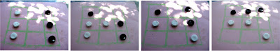 It's a leap frog sort of game, with "The Lake" sitting in five different positions (reminding me of yoga positions - and indeed, one of them -"Lake with Stones"- is Child's Pose) and the Tigers jumping over the lake. The Tiger becomes The Lake if he touches the Lake while jumping.